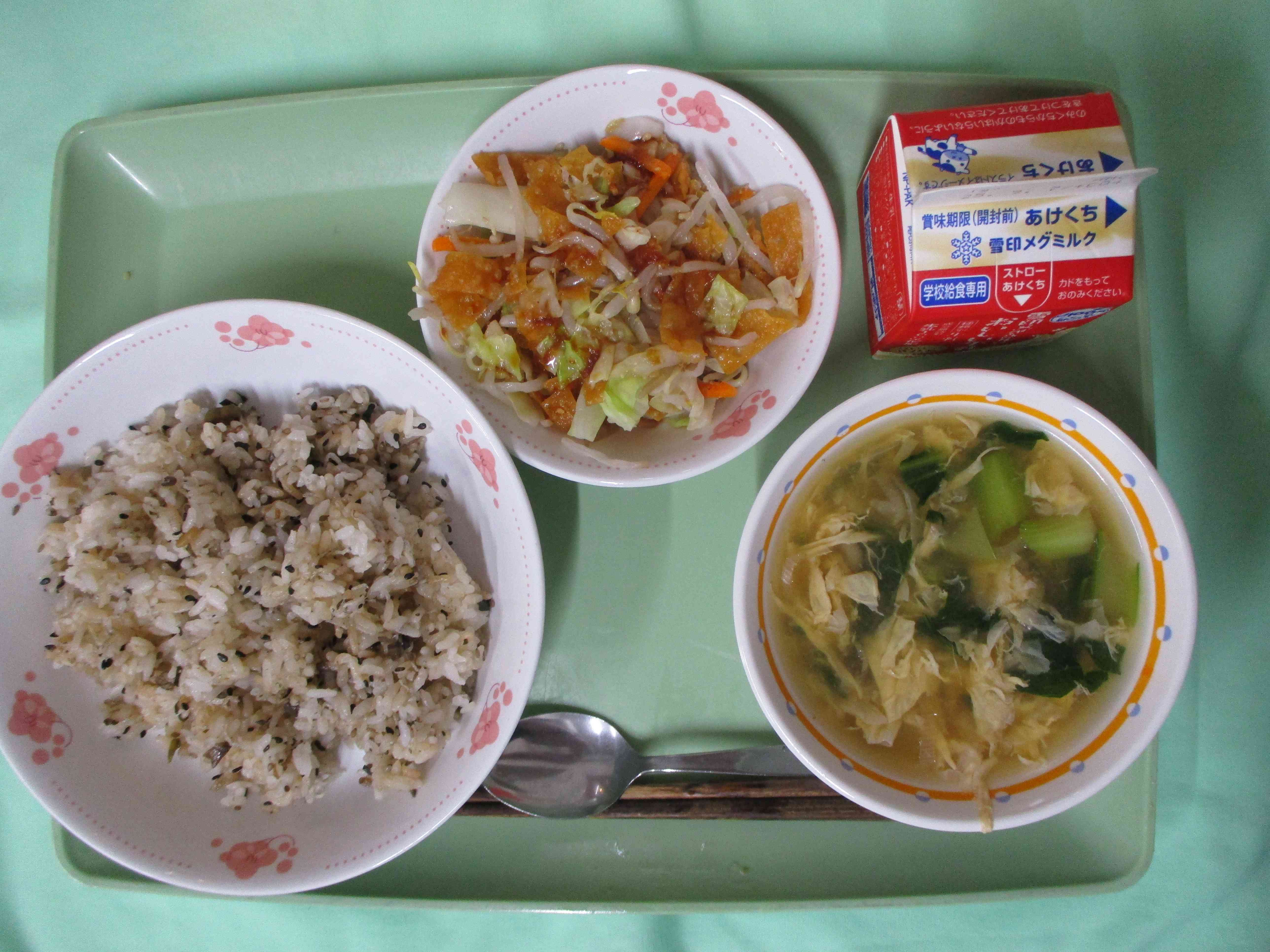 本日の献立、ごまじゃこ炒飯、ゆで野菜(揚げワンタン入り)青菜とコーンの卵スープ、牛乳です。