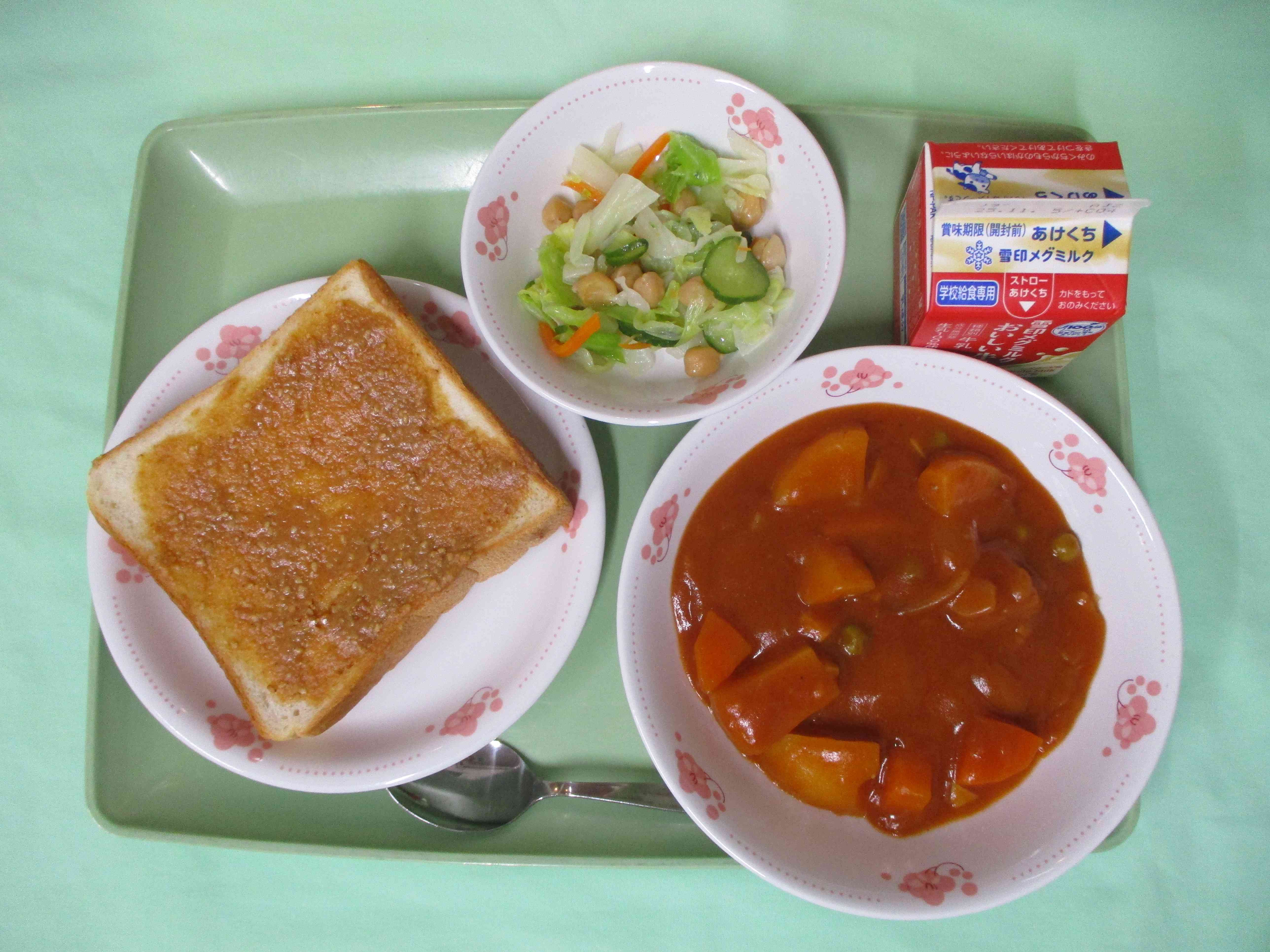 本日の献立、ごまきな粉トースト、ポークシチュー、ひよこ豆入りゆで野菜、牛乳です。