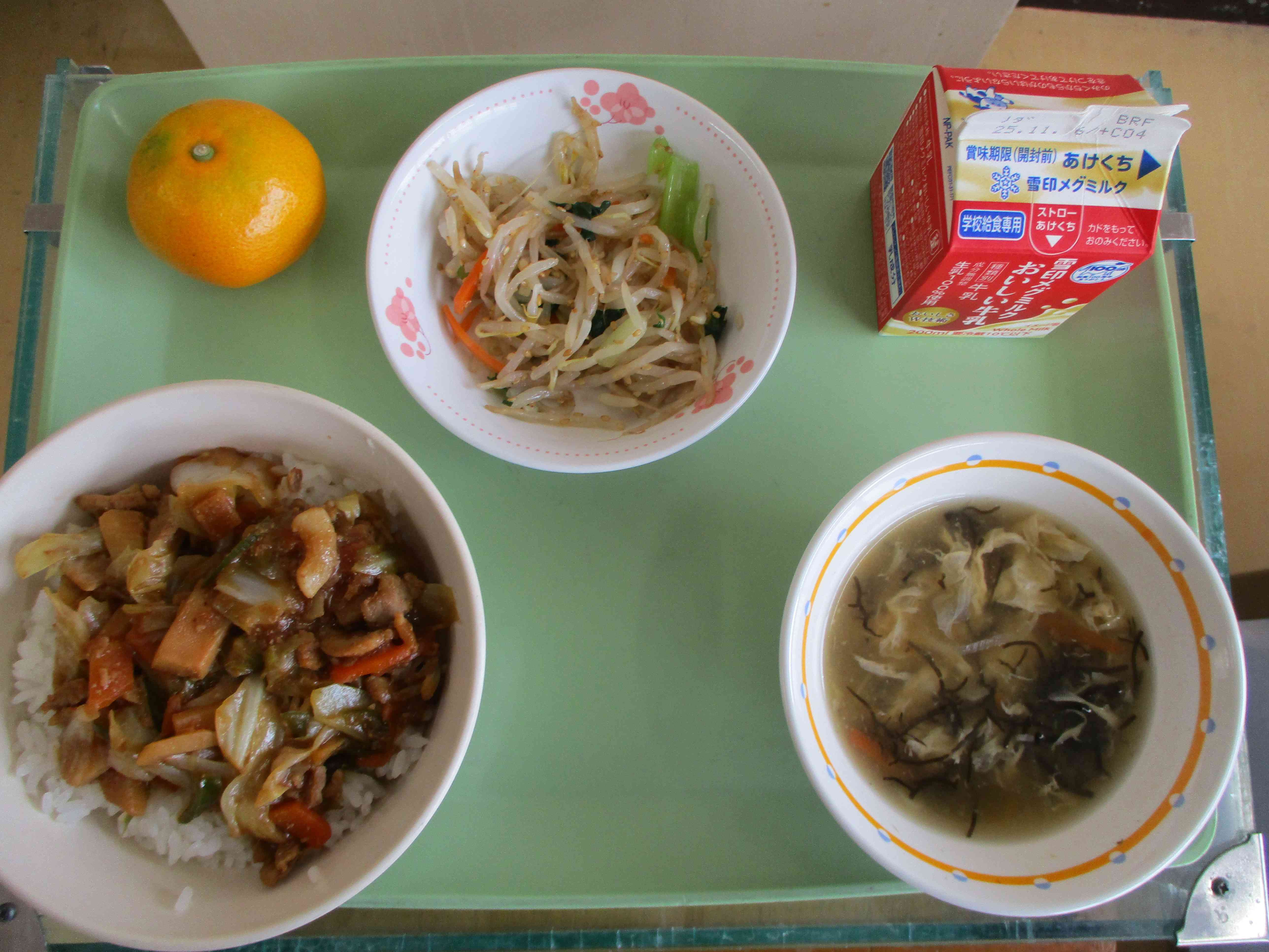 本日の献立、回鍋肉丼、ナムル、もずくとたまごのスープ、みかん、牛乳です。