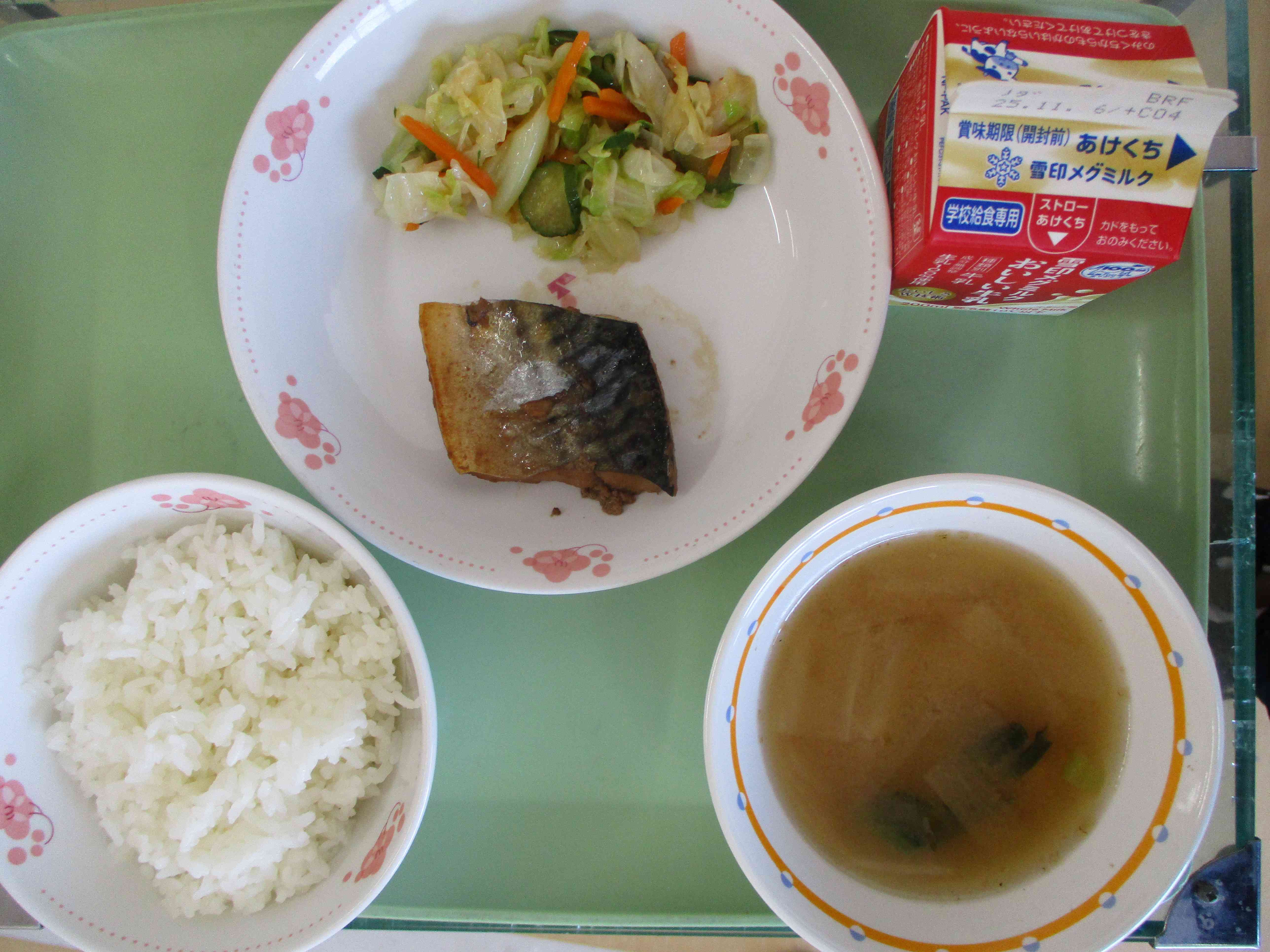 本日の献立、ご飯、さばの甘辛煮、ゆで野菜(しょうゆドレッシング)、みそ汁(大根、油揚げ、大葉)、牛乳です。