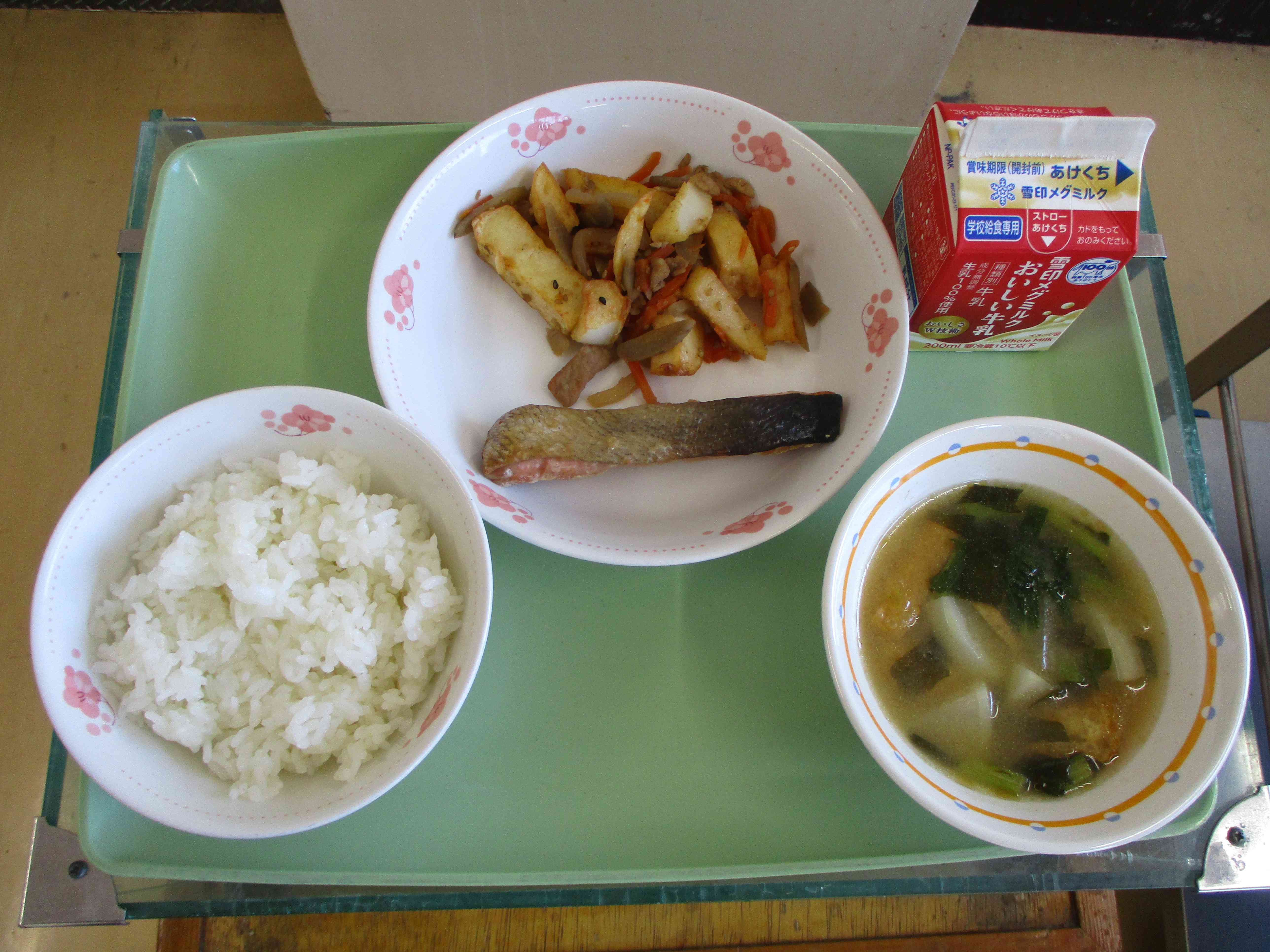 本日の献立は、ご飯、さけのバターしょうゆ焼き、じゃがいものきんぴら炒め、みそ汁、牛乳です。