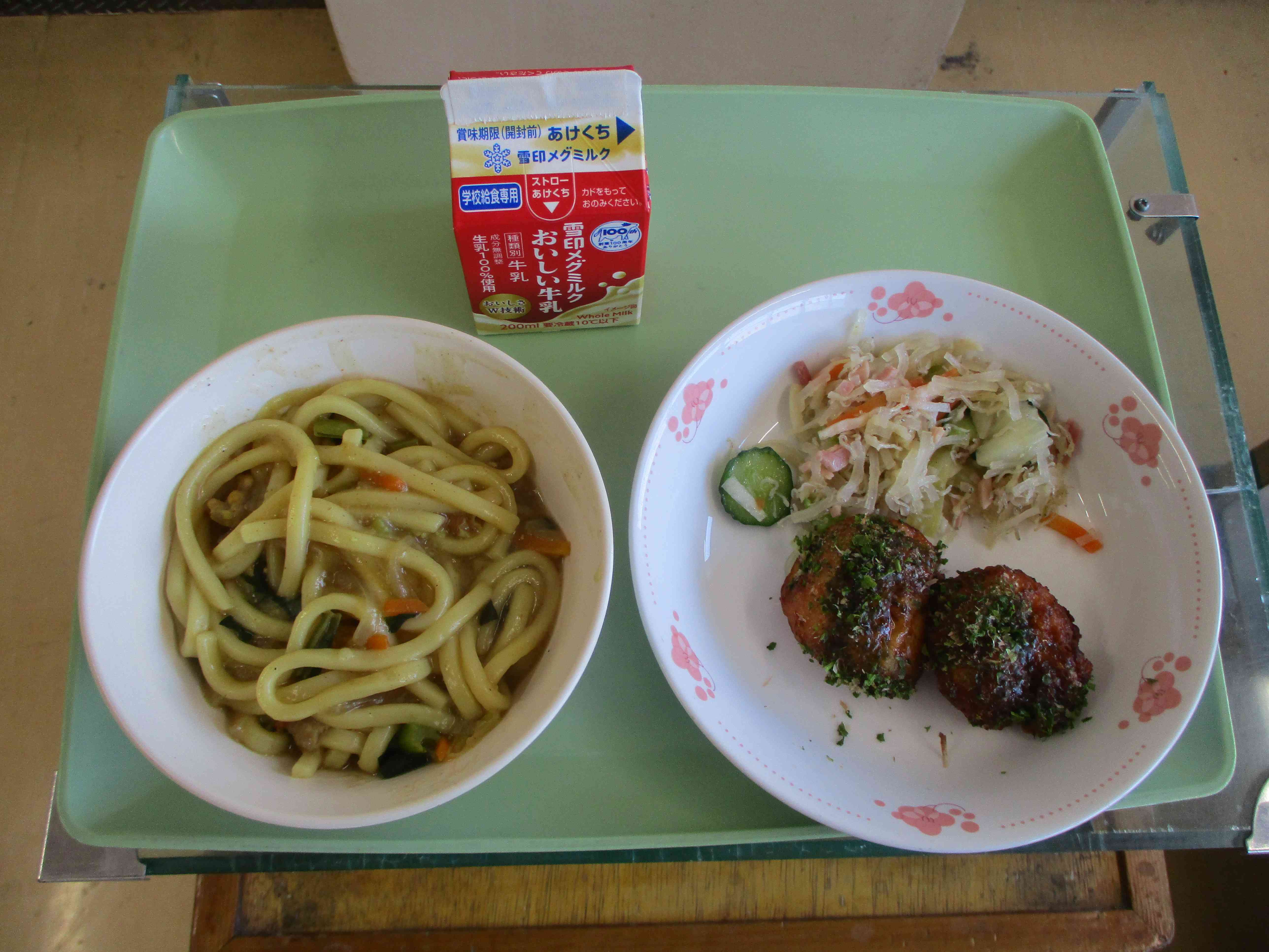 本日の献立は、カレーうどん、ポテト揚げ、はりはりゆで野菜、牛乳です。