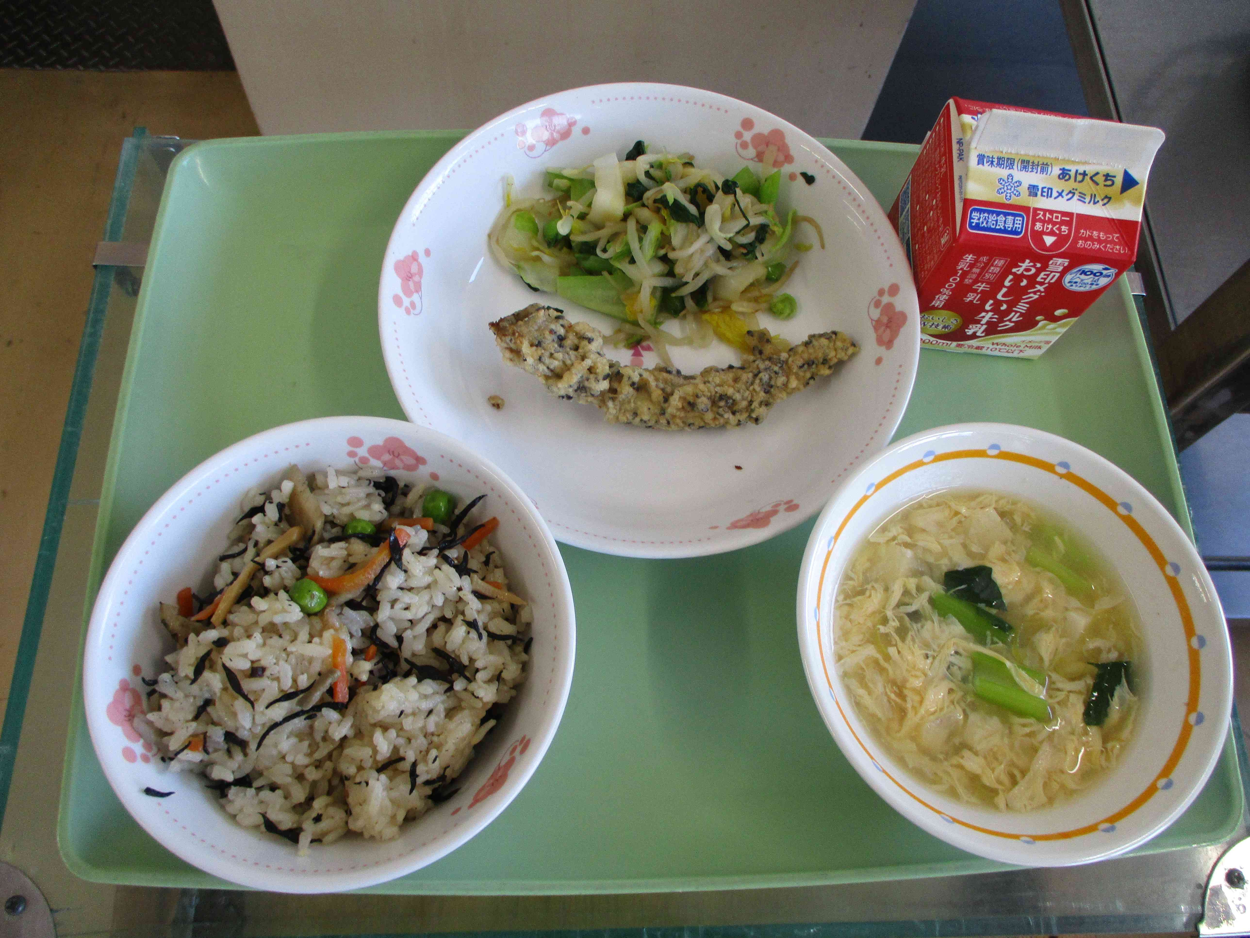 本日の献立は、ひじき入り五目ご飯、ししゃもの石垣揚げ、ゆで野菜(からしじょうゆ)、かきたま汁、牛乳です。