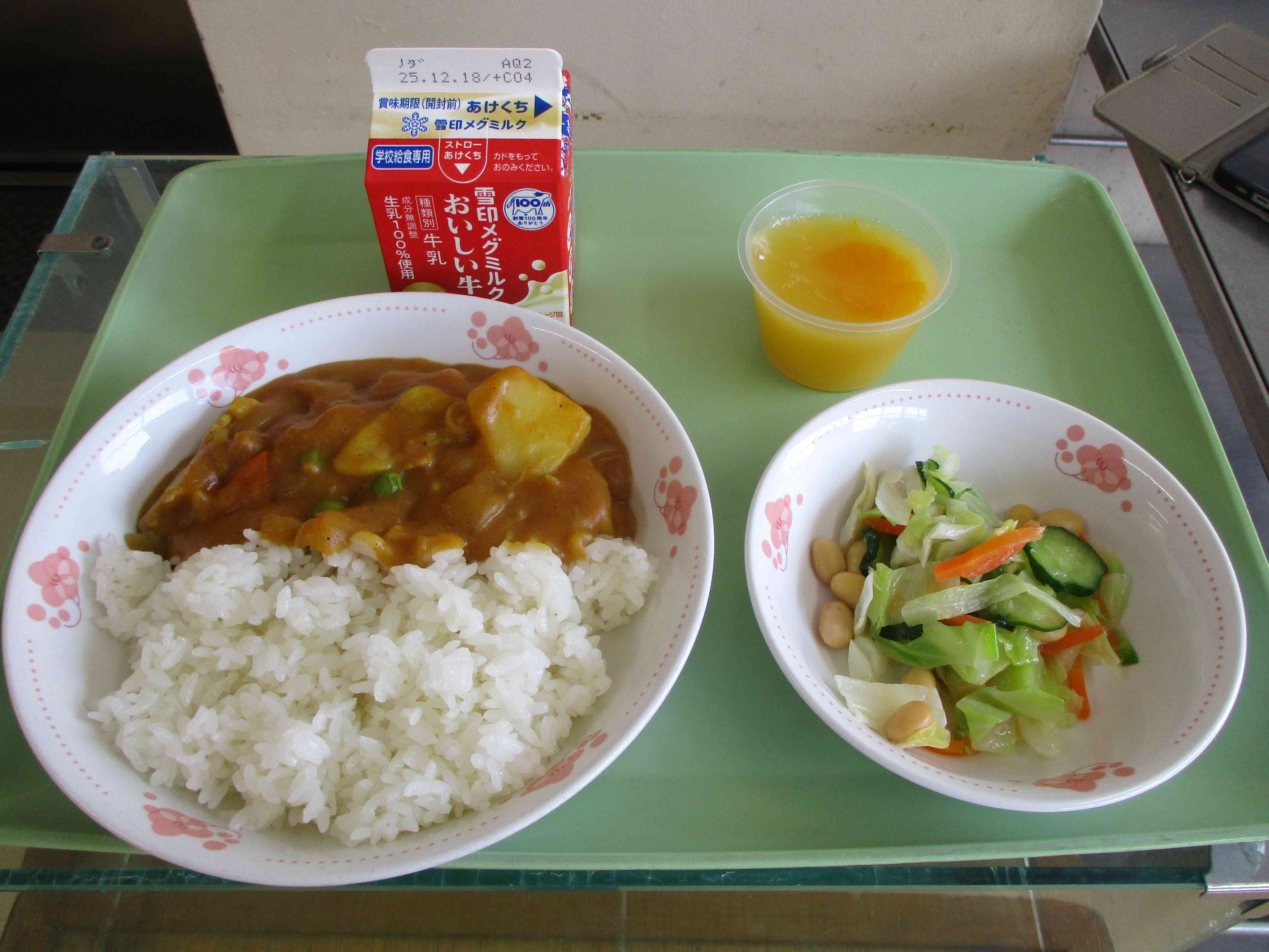本日の献立は、カレーライス、大豆入りゆで野菜、オレンジゼリー、牛乳です。
