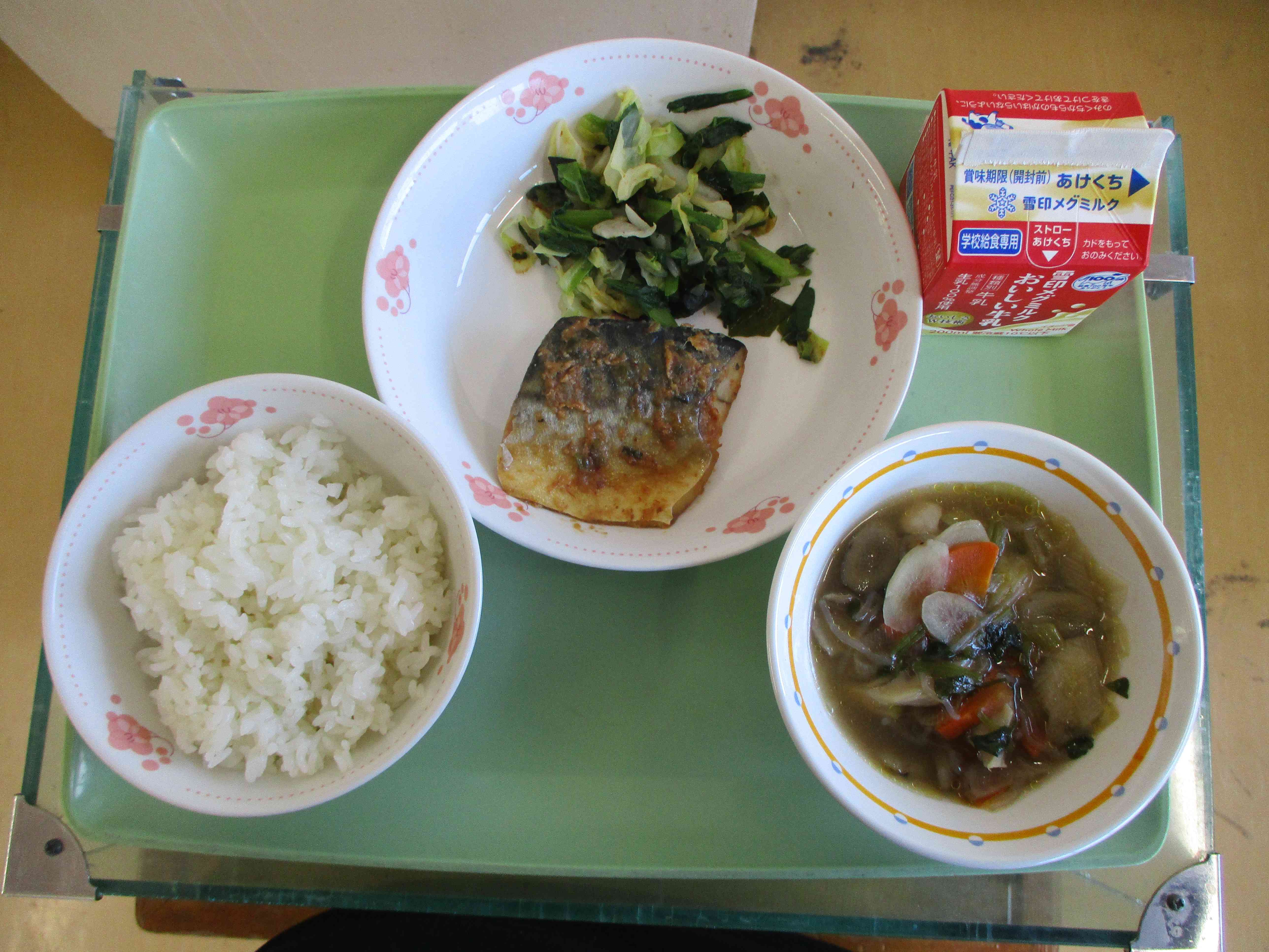 本日の献立は、ご飯、さばのねぎみそ焼き、おかかあえ、きりたんぽ汁、牛乳です。