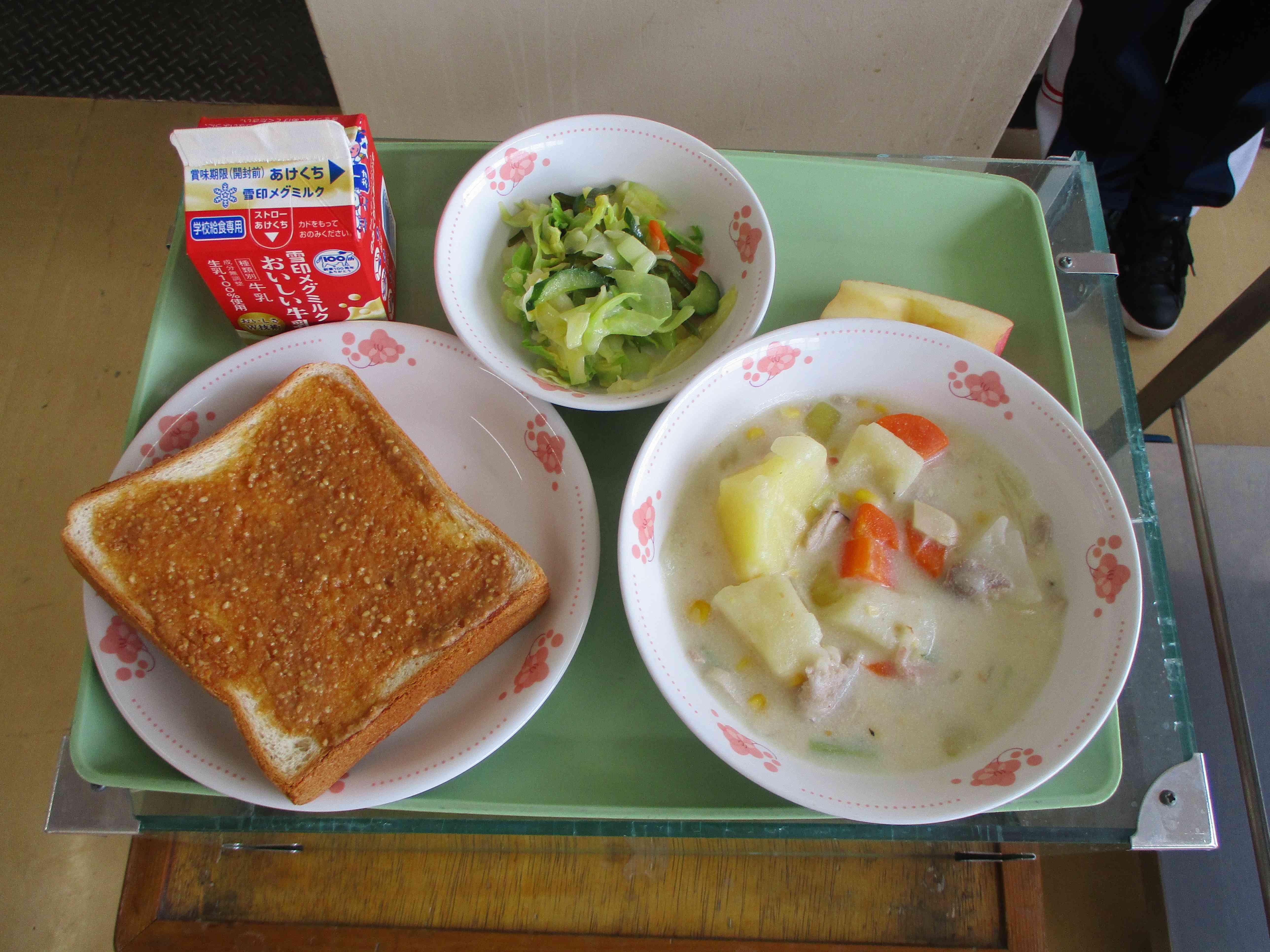 本日の献立は、ごまきな粉トースト、クリームシチュー、海そう入りゆで野菜、くだもの、牛乳です。