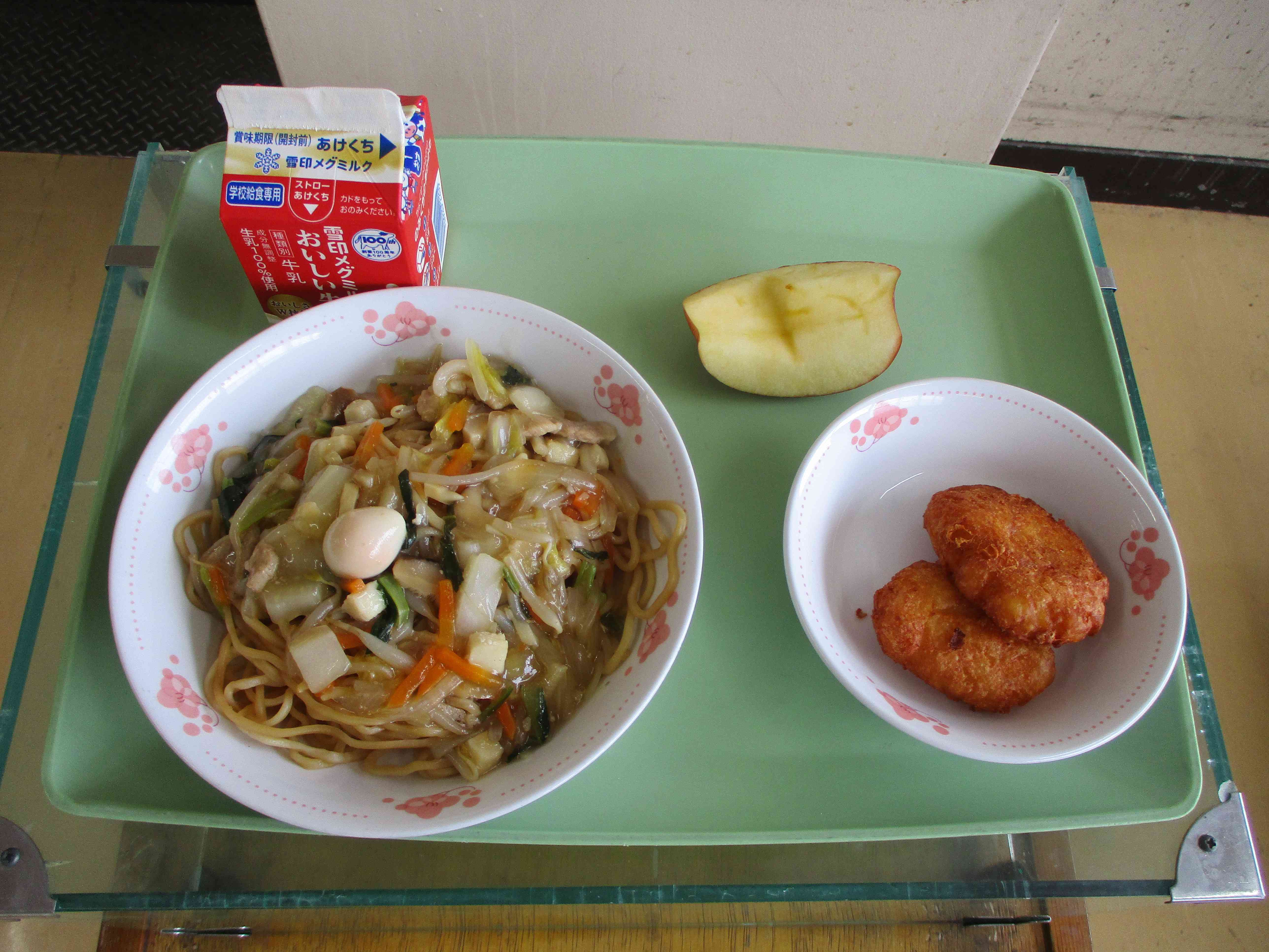 本日の献立は、炒めそば五目あんかけ(いか入り)、チーズじゃがまるくん、くだもの、牛乳です。