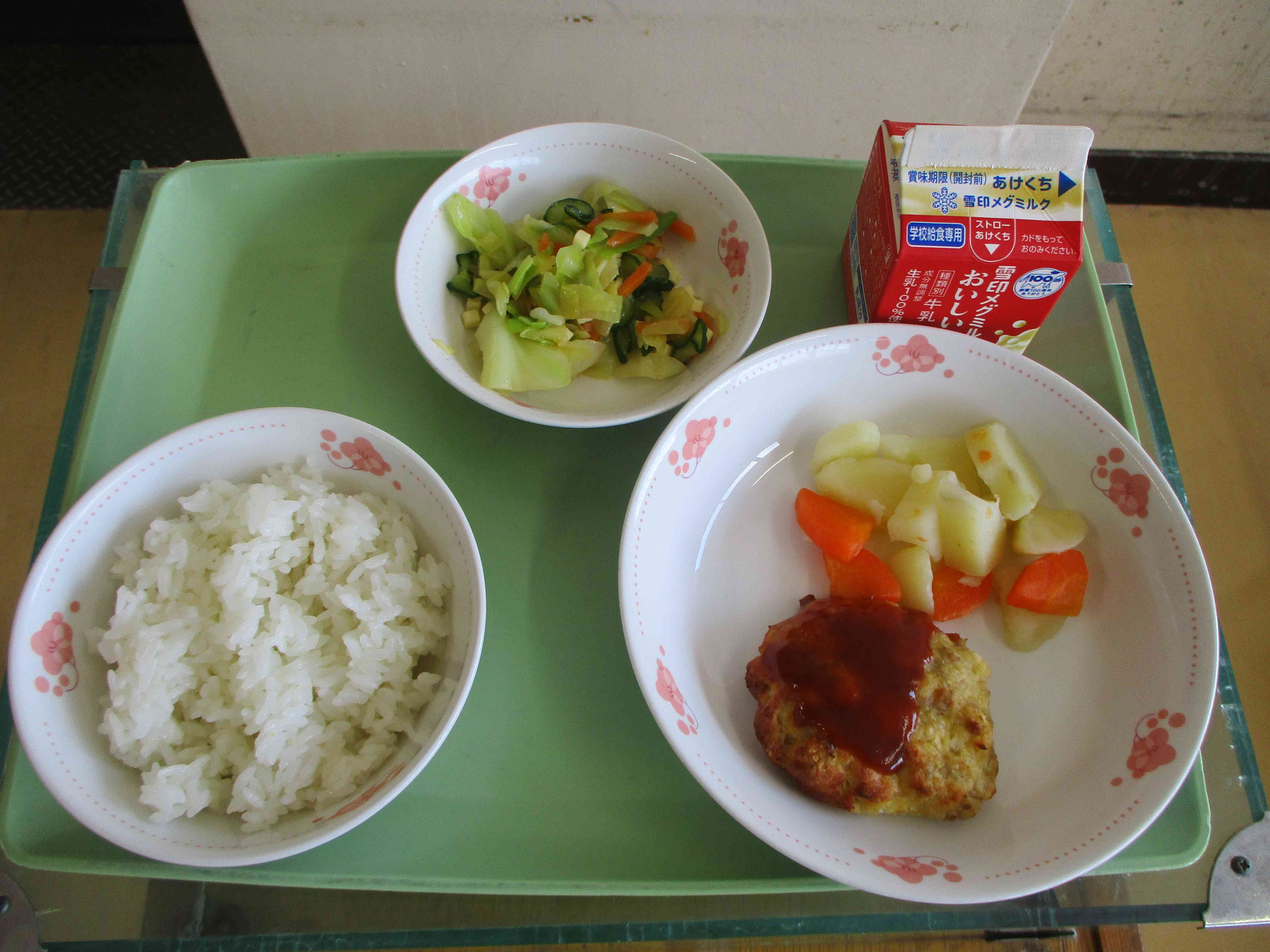 本日の献立は、ご飯、豆腐のハンバーグ、じゃがいものバター煮、チーズ入りゆで野菜、牛乳です。