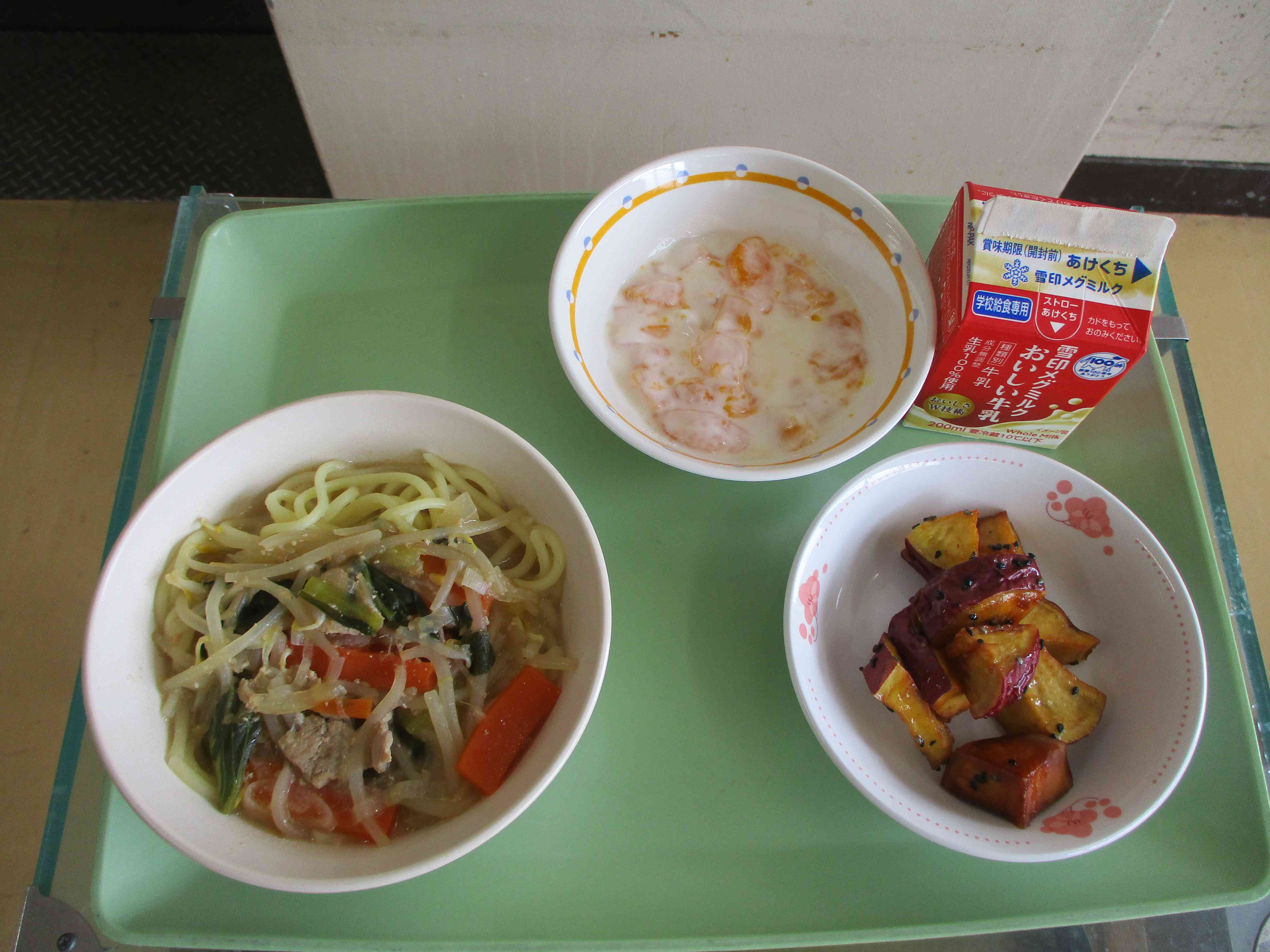 本日の献立は、みそラーメン、大学いも、フルーツのヨーグルトぞえ、牛乳です。